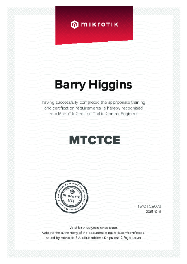 As of February 2016 Barry Higgins is now a fully qualified trainer for the following Mikrotik Courses: